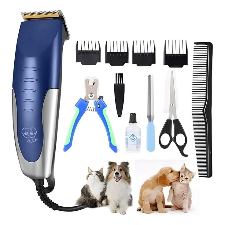 cortadora de pelo para perro Kit de 10 piezas. Incluye cortadora eléctrica, tijeras, peine, aceite lubricante, cepillo de limpieza, corta uñas, lima y 4 niveles de corte. (cabezales intercambiables: 3mm, 6mm, 9mm, 12mm).
